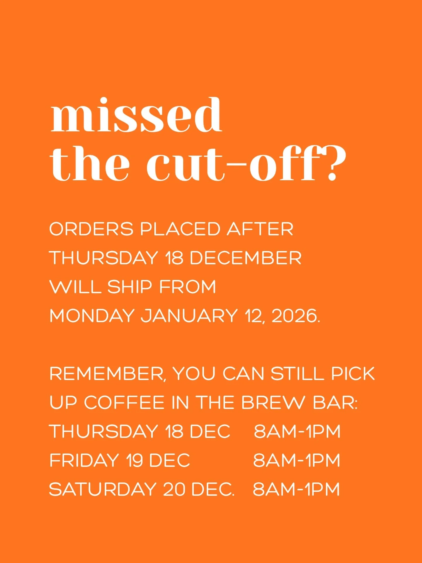 ANy orders placed after this will ship when we reopen MOnday January 12 , 2026.